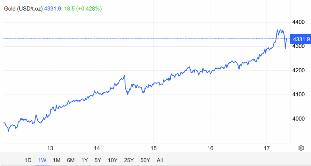 Kết thúc phiên giao dịch ngày 16/10, hợp đồng vàng giao ngay tiến 0,4% lên $4343,63/oz, sau khi vàng đạt mức cao kỷ lục $4330,42/oz.