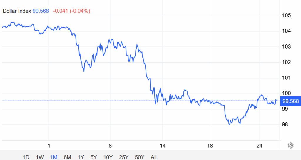 Chỉ số đô la Mỹ DXY tiếp tục giảm xuống dưới mốc 99,4 vào thứ Năm, thu hẹp mức phục hồi từ phiên trước và duy trì gần mức thấp nhất trong 3 năm là 98 hồi đầu tuần, do sự hoài nghi về một thỏa thuận thương mại giữa Mỹ và Trung Quốc làm dấy lên lo ngại về tính bền vững của sự vượt trội kinh tế Mỹ.