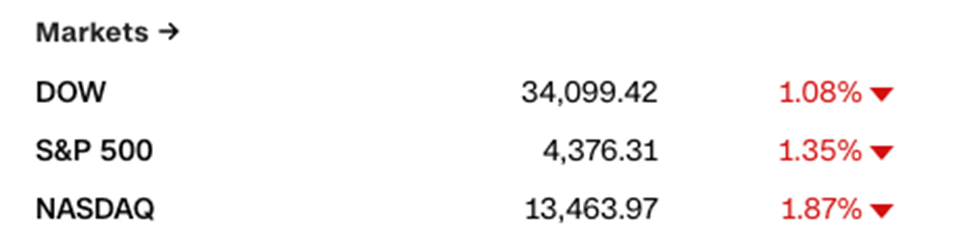 - Dow Jones: Ghi nhận 34,099.42, trải qua sự sụt giảm lớn -373.56 điểm, tương đương mức giảm -1.08%
