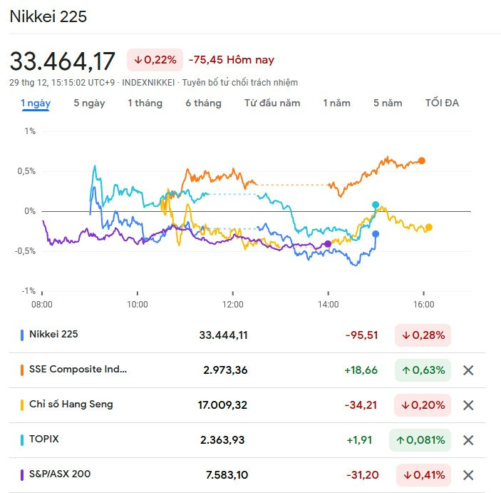Thị trường chứng khoán châu Á giao dịch khá giằng co vào thứ Sáu 29/12 trong bối cảnh chứng khoán toàn cầu ghi nhận năm tốt nhất kể từ năm 2019. Trong khi đó, thị trường trái phiếu và tiền tệ khá trầm lắng khi nhà đầu tư nhìn chung đã rời bàn giao dịch chuẩn bị cho kì nghỉ lễ năm mới.