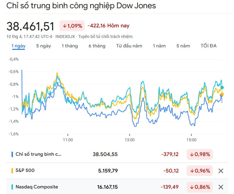 Kết thúc phiên giao dịch ngày thứ Tư ngày 10/04, chỉ số Dow Jones rớt 422,16 điểm (tương đương 1,09%) xuống 38.461,51 điểm. Chỉ số S&P 500 mất 0,95% còn 5.160,64 điểm. Chỉ số Nasdaq Composite lùi 0,84% xuống 16.17,36 điểm.