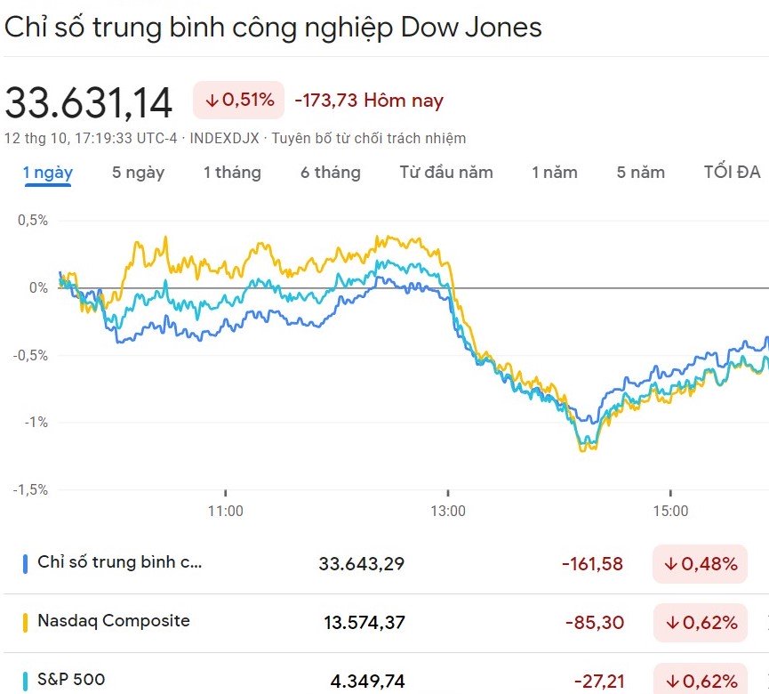Kết thúc phiên giao dịch ngày thứ Năm, Dow Jones Industrial Average giảm 0,51%, tương ứng 173,73 điểm và đóng cửa tại 33.631,14 điểm. S&P 500 giảm 0,62%, khép phiên tại 4.349,61 điểm. Chỉ số Nasdaq Composite giảm 0,63%, dừng chân tại 13.574,22 điểm. Phiên điều chỉnh này đã khiến cả ba chỉ số chính đều dứt chuỗi 4 phiên leo dốc liên tiếp.