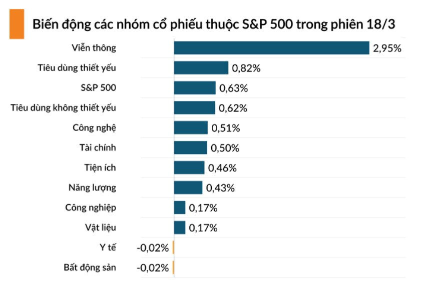 Đà tăng xuất hiện ở hầu hết các nhóm ngành S&P 500. Cổ phiếu Viễn thông tăng gần 3% hỗ trợ chỉ số. Nhóm Y tế và Bất động sản giảm không đáng kể 0,02%.