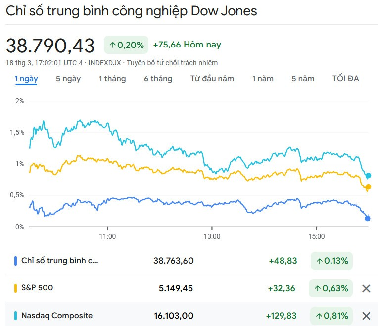 Kết thúc phiên giao dịch ngày thứ Hai 18/3, chỉ số Dow Jones tăng 75,66 điểm (tương đương 0,2%) lên 38.790,43 điểm. Chỉ số S&P 500 cộng 32,33 điểm (tương đương 0,63%) lên 5.149,42 điểm, còn chỉ số Nasdaq Composite tiến 0,82% lên 16.103,45 điểm.