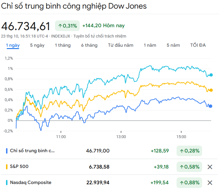 Cùng chiều, chỉ số Dow Jones tăng 144,20 điểm (tương đương 0,31%) lên 46.734,61 điểm.