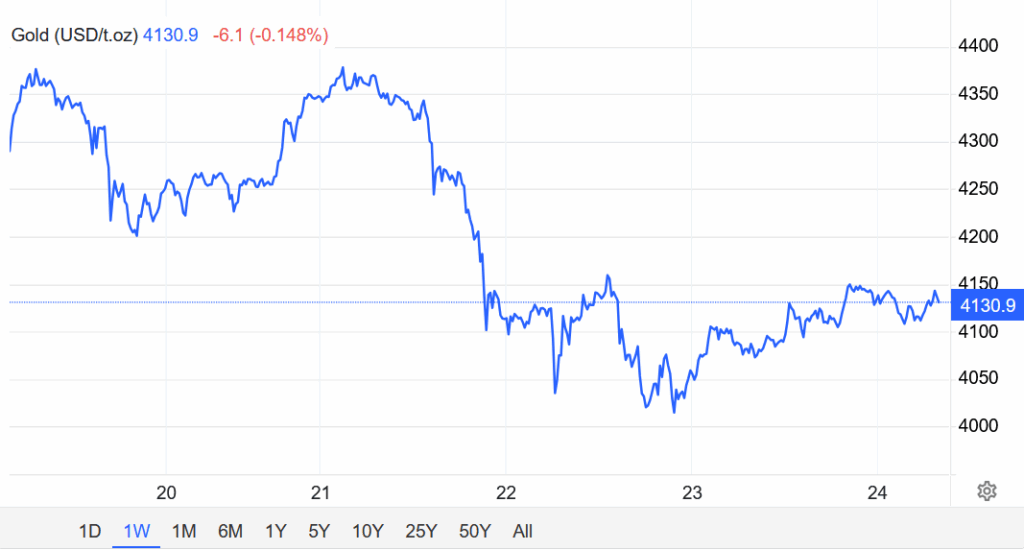 Kết thúc phiên giao dịch ngày 23/10, hợp đồng vàng giao ngay tiến 1,1% lên $4140,19/oz. Giá vàng đã giảm xuống mức thấp nhất trong gần 2 tuần trong phiên trước đó.