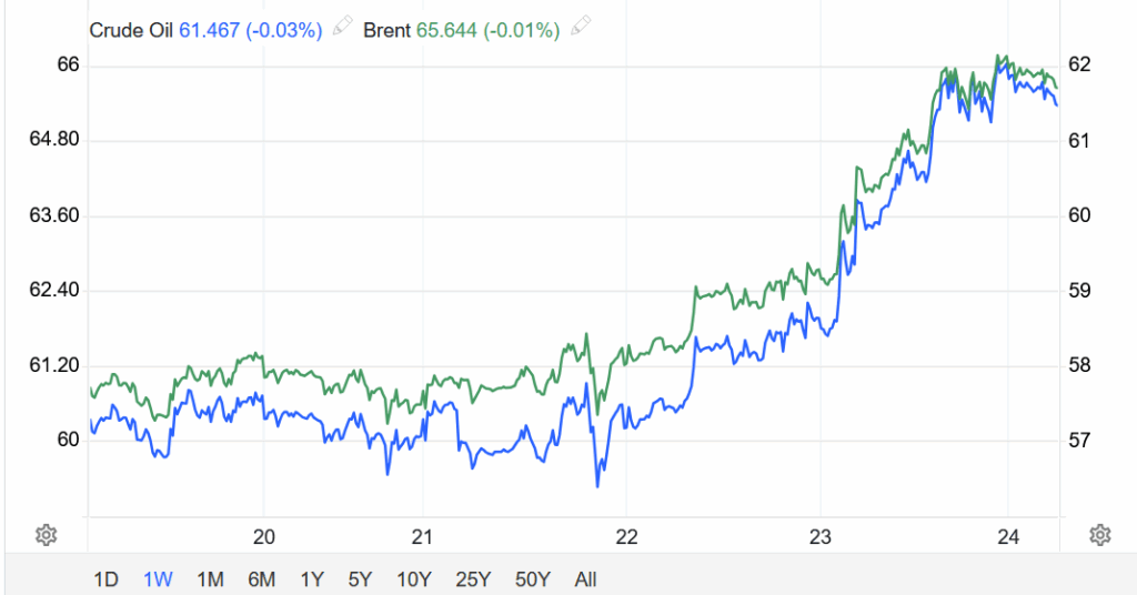 Kết thúc phiên giao dịch ngày 23/10, hợp đồng dầu Brent tiến 3,40 USD (tương đương 5,43%) lên 65,99 USD/thùng.