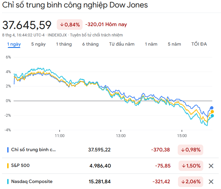 Kết phiên giao dịch thứ Ba ngày 08/04, chỉ số Dow Jones lùi 320,01 điểm (tương đương 0,84%) xuống 37.645,59 điểm, nâng tổng mức lao dốc trong 4 phiên do lo ngại về thuế quan lên hơn 4,500 điểm. Cổ phiếu Apple dẫn đầu đà giảm khi chi phí của nhà sản xuất iPhone tăng vọt do mức thuế mới của Trung Quốc. Tại mức đỉnh trong phiên, chỉ số Dow Jones tăng 3,9%.