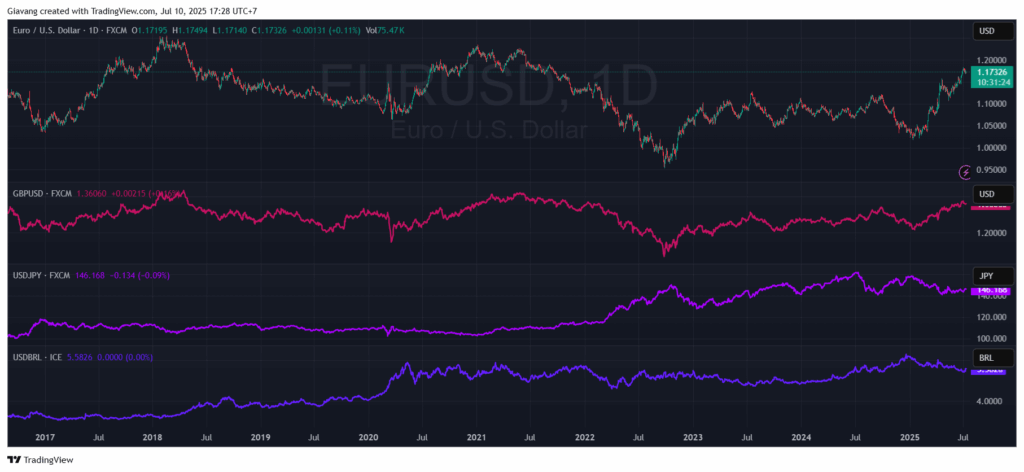 Đồng Real Brazil chịu áp lực bán mạnh vào thứ Năm, với cặp USD/BRL tăng hơn 1% trong ngày, giao dịch quanh mức 5,54. Ông Trump hôm thứ Tư tuyên bố rằng Brazil sẽ bị áp thuế 50% nếu nước này không chấm dứt “cuộc săn phù thủy” nhằm vào cựu tổng thống cánh hữu Jair Bolsonaro.