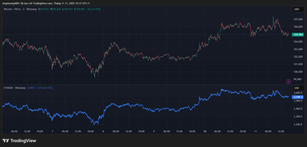 Thị trường tiền kĩ thuật số đảo chiều giảm sau phiên đầu tuần tăng tốt. BTC/USD hiện giảm về quanh 105.000. ETH/USD lùi về 3550.