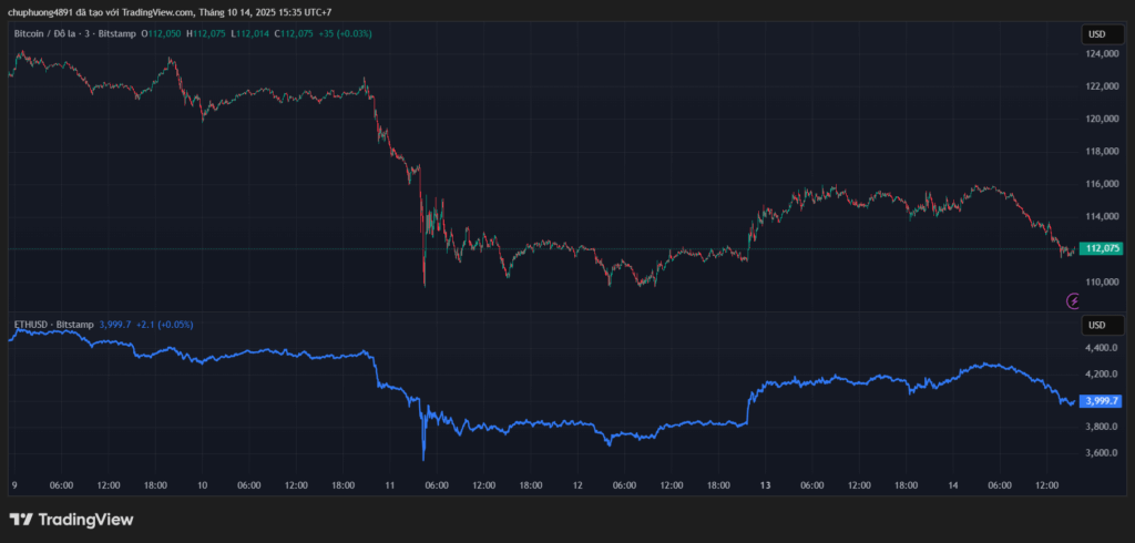 Thị trường tiền kĩ thuật biến động cực mạnh. BTC/USD lùi về 112.000. ETH/USD giảm về dưới 4000.