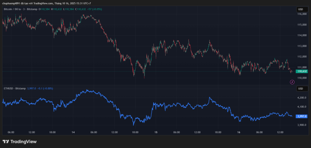 Thị trường tiền kĩ thuật số đã chậm lại đà giảm sau khi rơi sâu từ đỉnh kỉ lục. BTC/USD lùi về 110.000. ETH/USD giảm về dưới 4000.