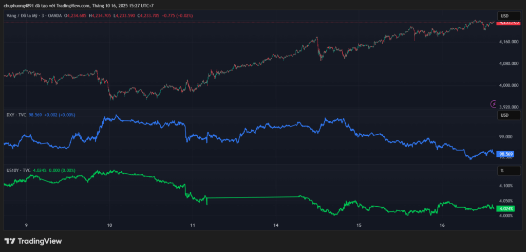 Giá vàng tiếp tục tăng cao, chạm đỉnh mới mọi thời đại $4242/oz và có gặp áp lực bán chốt lời nhẹ nhưng không đáng kể.