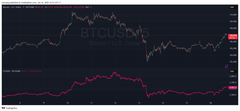 Thị trường tiền số đảo chiều tăng sau đà giảm cuối tuần trước. Hiện BTC/USD quanh mức 106.900. ETH/USD tăng lên mốc 2622.