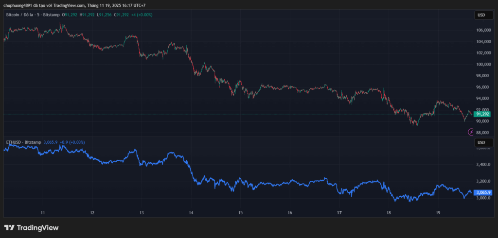 Thị trường tiền kĩ thuật số gặp nhiều khó khăn. BTC/USD lùi về 91.000. ETH/USD cố gắng giữ mốc 3000.