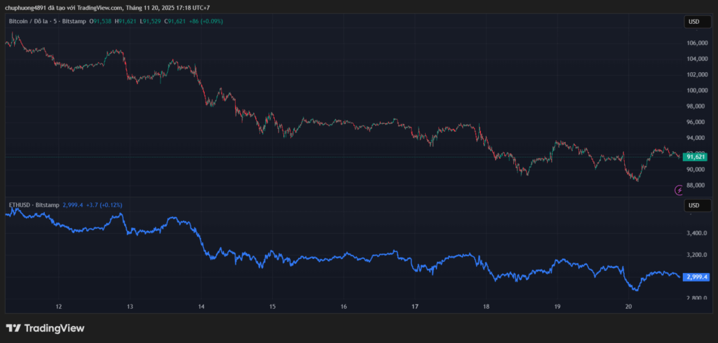 Thị trường tiền kĩ thuật số chững lại sau nhịp giảm. BTC/USD quanh vùng 91.000. ETH/USD rời mốc 3000.