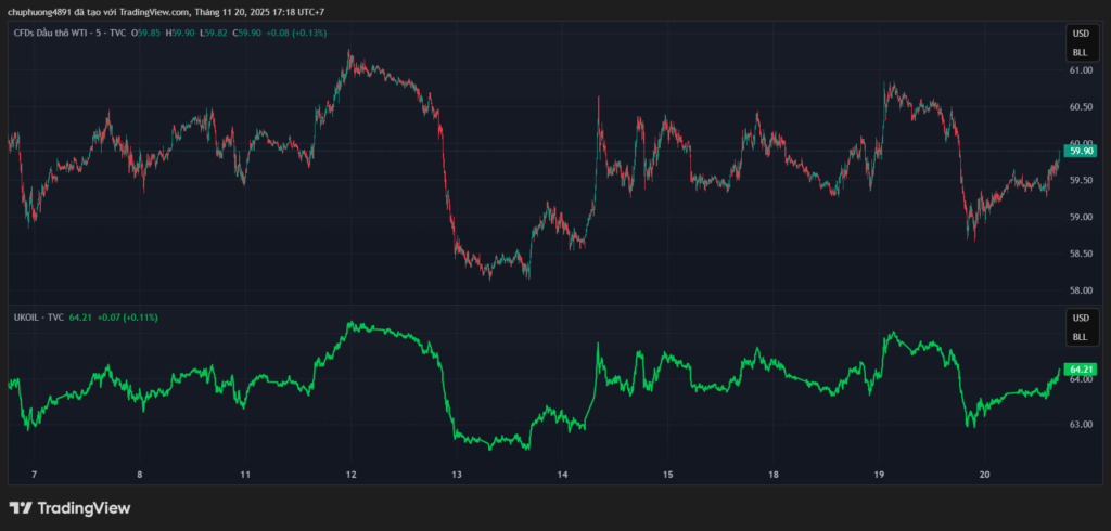 Thị trường năng lượng nhích nhẹ. Giá dầu WTI tiến lên gần mốc 60USD/thùng còn dầu Brent tiếp cận mốc 64USD/thùng.
