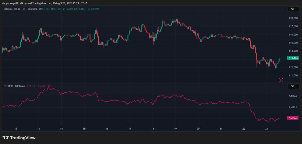Thị trường tiền kĩ thuật số sau cú rơi mạnh đang tích lũy lại. BTC quanh vùng 113.000 USD còn ETH neo mốc 4200USD.