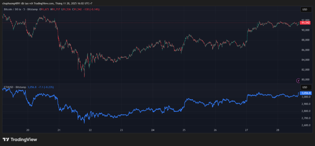 Thị trường tiền kĩ thuật số liên tục tăng từ đầu tuần. BTC/USD vượt mốc 91.500. ETH/USD chinh phục ngưỡng 3000.