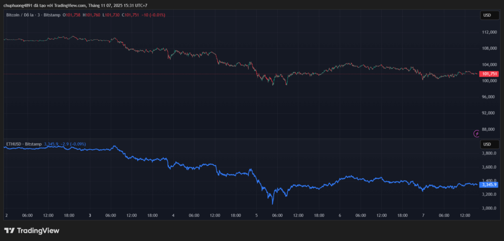 Thị trường tiền kĩ thuật số giằng co. BTC/USD quanh mốc 101.700. ETH/USD quanh 3350.