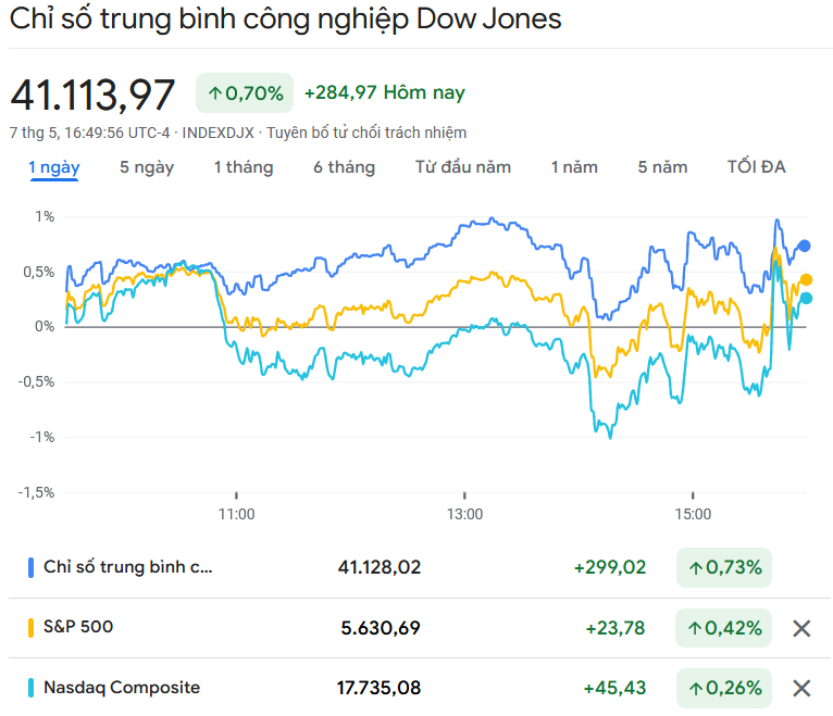 Chỉ số Dow Jones cộng 284,97 điểm (tương đương 0,70%) lên 41.113,97 điểm.