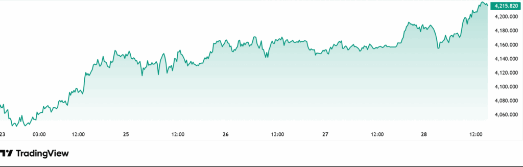 Đến tối thứ Năm, vàng có cú bứt phá thứ hai, và trong phiên Mỹ thứ Sáu, sự trở lại của nhà đầu tư sau kỳ nghỉ lễ đã đẩy giá lên đỉnh tuần 4.226,91 USD/oz – tiến sát mốc 4.200 ngay tại mở cửa.