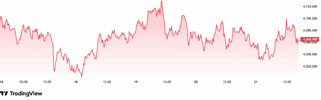 Vàng mở tuần tại 4.100 USD/oz, nhưng liên tục thất bại trong việc giữ vững mốc tâm lý này. Sau lần bị từ chối thứ hai tại vùng 4.100 USD, giá trượt về 4.058 USD/oz, rồi nhanh chóng hồi phục lên 4.090 USD trước khi bị bán mạnh trong phiên New York.