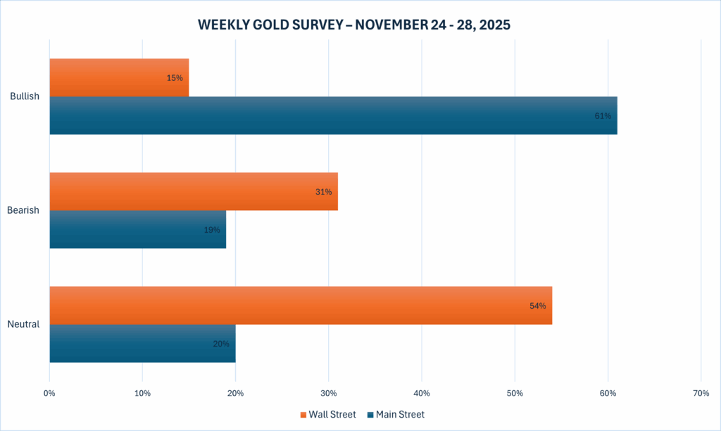 Giá vàng tiếp tục dao động mạnh quanh vùng 4.100 USD/oz trong tuần qua, khi thị trường tài chính bị chi phối bởi biến động của nhóm cổ phiếu AI và tâm lý chờ đợi tín hiệu rõ ràng từ Cục Dự trữ Liên bang Mỹ (Fed). Dù giới phân tích Wall Street trở nên thận trọng, nhà đầu tư Main Street vẫn duy trì quan điểm tăng giá.