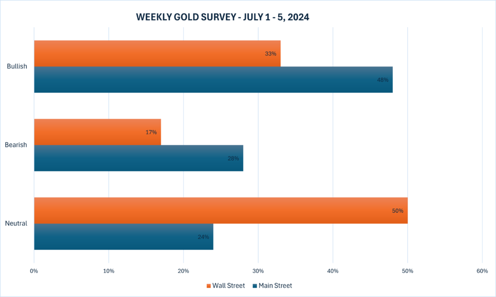 Khảo sát trực tuyến ghi nhận 178 phiếu trả lời, các nhà đầu tư ở Main Street có quan điểm chia rẽ về triển vọng ngắn hạn của vàng. 86 nhà giao dịch bán lẻ, tương đương 48%, dự đoán giá vàng sẽ tăng vào tuần tới. 50 người khác, chiếm 28%, dự đoán thị trường tiêu cực. 42 phiếu, đại diện cho 24% còn lại, nhận thấy giá tiếp tục đi ngang.