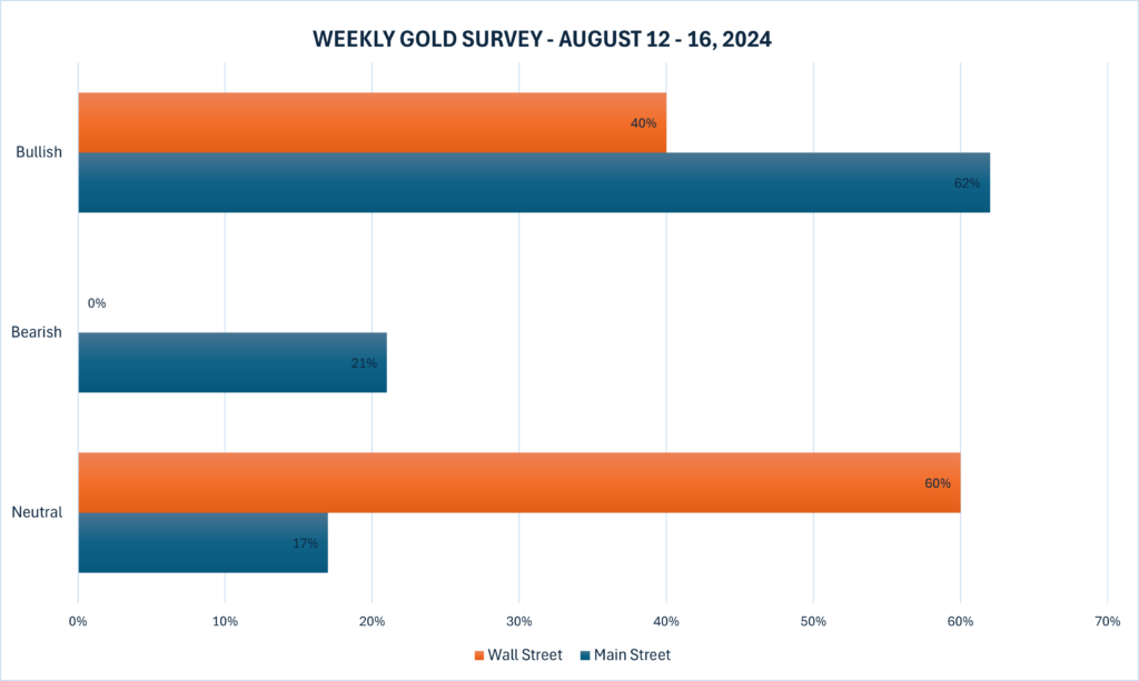 Trong khi đó, 210 phiếu đã tham gia khảo sát trực tuyến với hầu hết các nhà đầu tư Main Street vẫn giữ quan điểm lạc quan. 130 nhà giao dịch bán lẻ, chiếm 62%, kỳ vọng giá vàng sẽ tăng vào tuần tới. 45 người khác, hay 21%, lo ngại giá vàng giảm. 35 phiếu, đại diện cho 17% còn lại, cho rằng thị trường sẽ tích lũy trong biên độ hẹp.