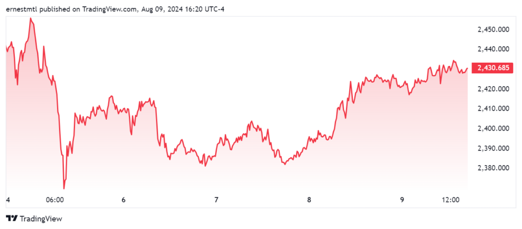 Sau khi mở cửa tuần giao dịch gần $2440/oz, giá vàng giao ngay hai lần bật lên từ vùng $2420 do chứng khoán Nhật Bản rơi không phanh, khiến tiền điện tử và các tài sản rủi ro khác giảm mạnh trong giao dịch qua đêm. Vàng ban đầu đã tăng, với giá giao ngay tăng lên mức cao nhất trong phiên ngay sát mốc $2460 khi các nhà đầu tư tìm nơi trú ẩn an toàn. Tuy nhiên, sự hoảng loạn lan rộng trong phiên giao dịch châu Á và châu Âu, vàng lại một lần nữa giảm xuống và sau khi không giữ được mức hỗ trợ là $2420/oz, giá giao ngay bắt đầu giảm ngay sau 6:30 sáng EDT, rơi tới 60USD chỉ trong 2 giờ.