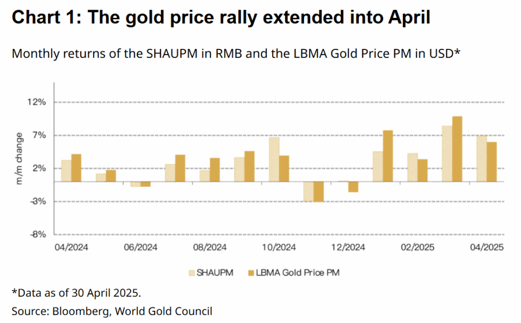 Giá vàng toàn cầu tiếp tục leo thang trong tháng 4, kéo theo giá vàng tại Trung Quốc lập kỷ lục. Chỉ số LBMA Gold Price PM tính theo USD đạt mức cao nhất kể từ năm 2011, trong khi SHAUPM tính bằng Nhân dân tệ (RMB) ghi nhận mức tăng mạnh nhất trong 19 năm qua.