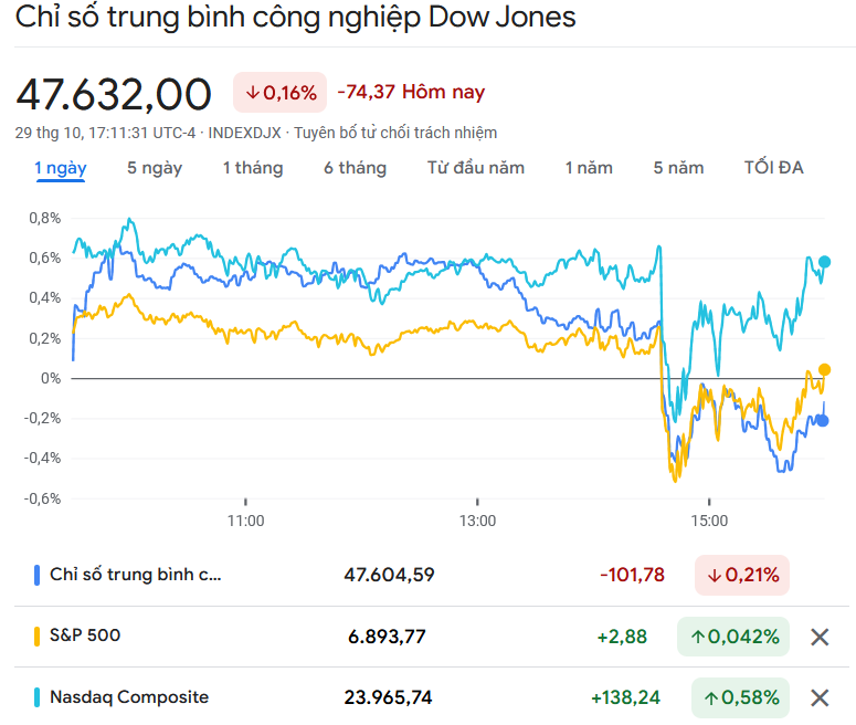 Đóng cửa phiên giao dịch thứ Tư ngày 29/10, chỉ số Dow Jones lùi 74,37 điểm (tương đương 0,2%) xuống 47.632,00 điểm. Dow Jones đã tăng tới 334 điểm, có thời điểm ghi nhận mức cao mọi thời đại mới trước khi quay đẩu giảm điểm.
