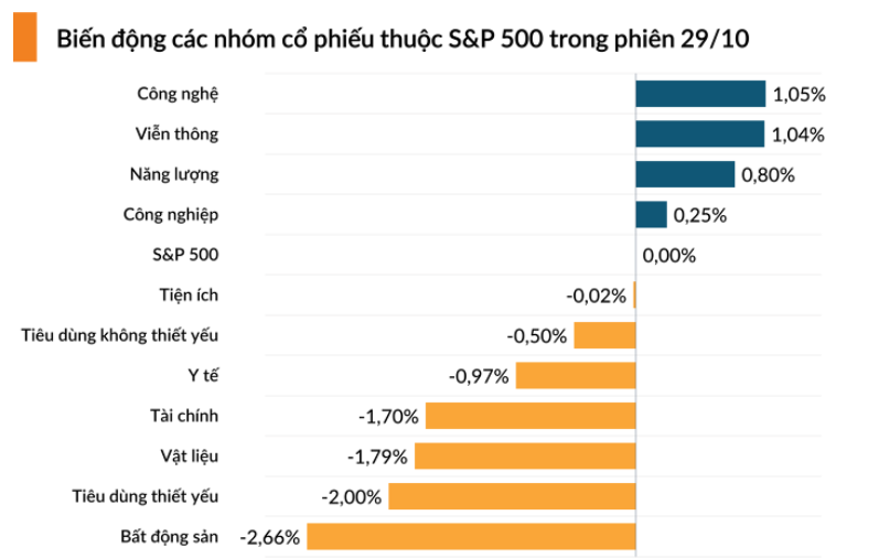 Bảng điện tử S&P 500 tiếp tục ghi nhận đà giảm mạnh của cổ phiếu Bất động sản. Công nghệ vẫn là điểm sáng của thị trường.