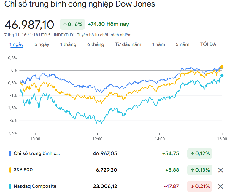 Chỉ số Dow Jones cộng 74,80 điểm (tương đương 0,16%) lên 46.987,10 điểm.