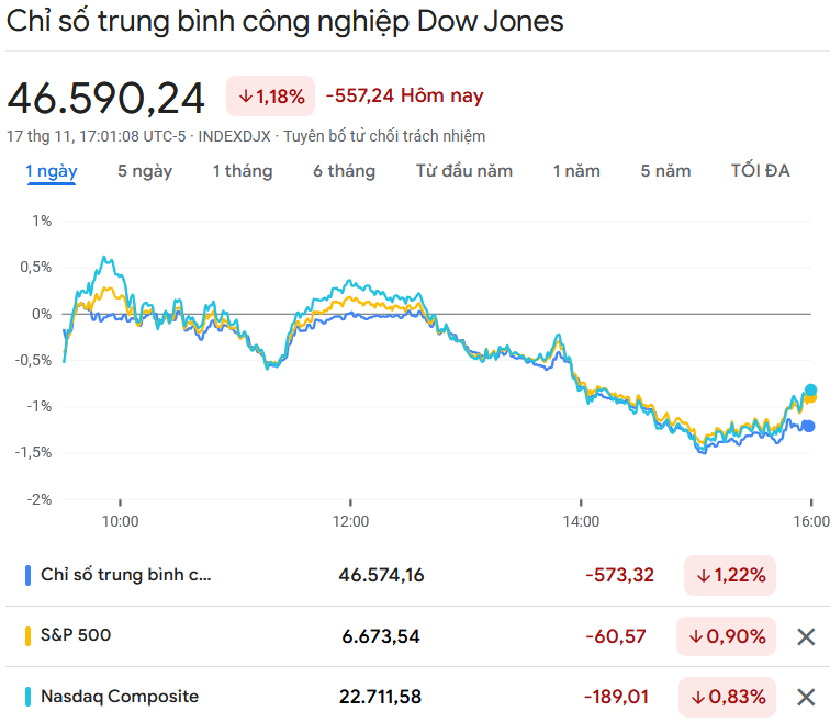 Đóng cửa phiên giao dịch thứ Hai ngày 17/11, chỉ số Dow Jones rớt 557,24 điểm (tương đương 1,18%) xuống 46.590,24 điểm.