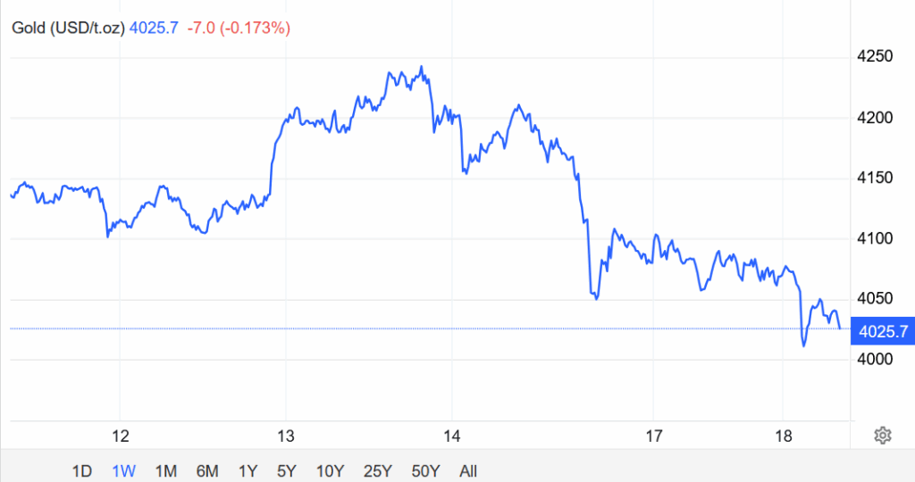 Kết thúc phiên giao dịch ngày 17/11, hợp đồng vàng giao ngay lùi 1,5% xuống $4019,12/oz.