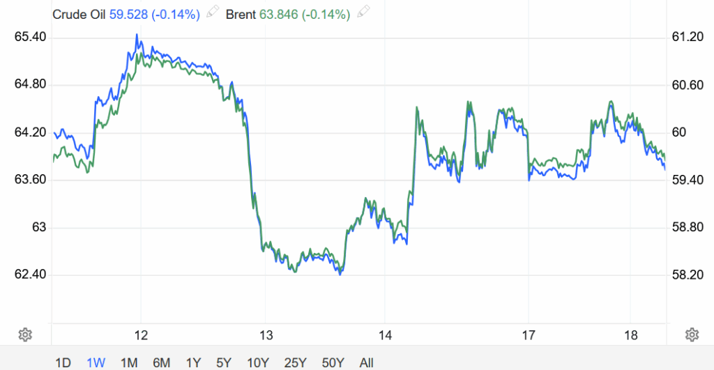 Hợp đồng dầu WTI mất 18 xu (tương đương 0,3%) còn 59,91 USD/thùng.