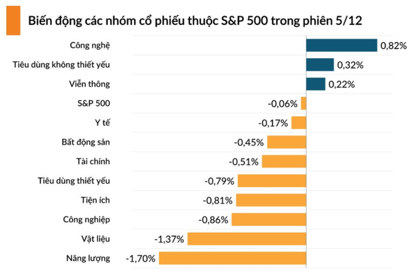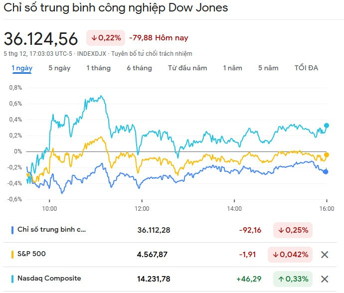 Đóng cửa phiên giao dịch ngày 5/12, chỉ số Dow Jones trượt 79,88 điểm (tương ứng 0,22%) xuống 36.124,56 điểm. S&P 500 lùi 0,06% còn 4.567,18 điểm. Trong khi đó, chỉ số Nasdaq Composite tăng 0,31% lên 14.229,91 điểm nhờ đà bứt phá của nhóm cổ phiếu công nghệ.