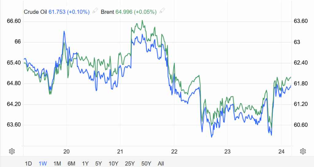 Dầu WTI tăng 33 US cent tương đương 0,54% lên 61,53 USD/thùng.