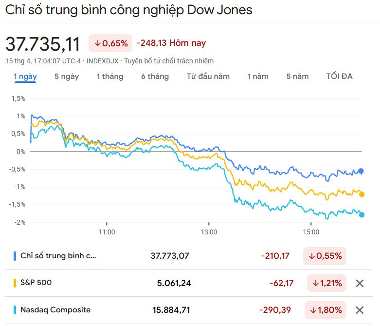 Kết thúc phiên giao dịch ngày thứ Hai ngày 15/04, chỉ số Dow Jones lùi 248,13 điểm (tương đương 0,65%) xuống 37.735,11 điểm. Chỉ số này đã xoá sạch mức tăng hơn 1% vào đầu phiên để ghi nhận phiên giảm thứ sáu liên tiếp, đánh dấu chuỗi lao dốc dài nhất kể từ tháng 6/2023. Mức giảm trong ngày thứ Hai cũng kéo chỉ số này gần như đi ngang trong năm 2024, một bước ngoặt đáng kinh ngạc sau khi dao động gần mốc 40.000 điểm chỉ vài tuần trước đó.