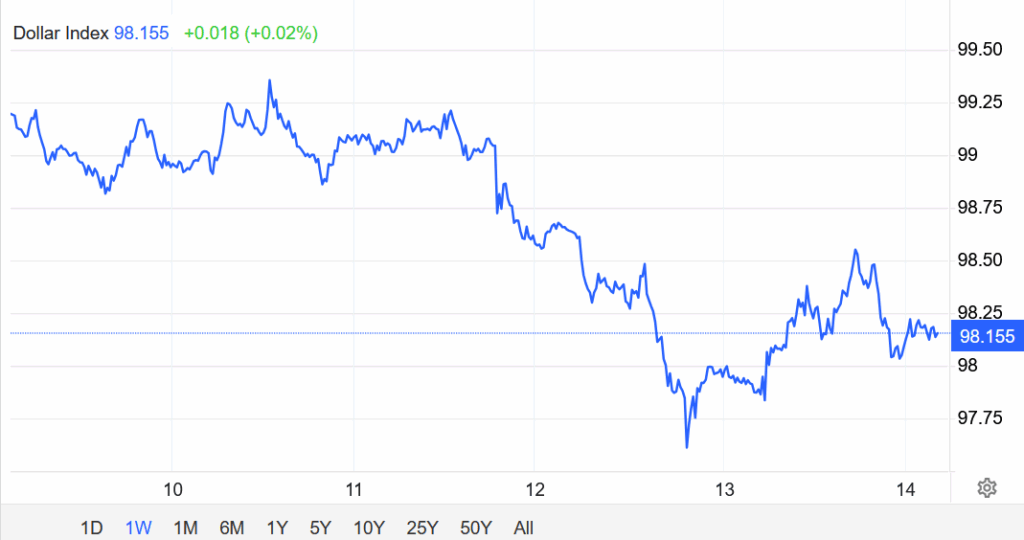 Chỉ số đô la Mỹ DXY ượt mốc 98,2 vào thứ Sáu, phục hồi từ mức thấp nhất trong nhiều năm khi căng thẳng địa chính trị leo thang ở Trung Đông thúc đẩy nhu cầu đối với các tài sản trú ẩn an toàn. Động thái này diễn ra sau cuộc tấn công phủ đầu của Israel nhằm vào Iran, nhắm vào chương trình hạt nhân của Tehran và cam kết tiếp tục chiến dịch cho đến khi mối đe dọa bị loại bỏ. Các quan chức Mỹ xác nhận rằng Washington không tham gia hay hỗ trợ trong cuộc tấn công này.