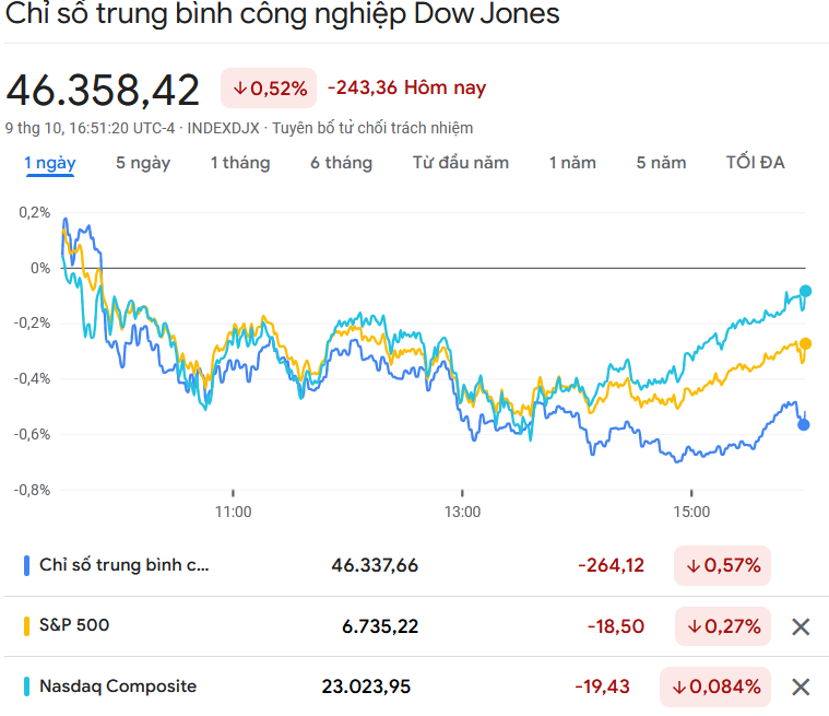 Chỉ số Dow Jones mất 243,36 điểm (tương đương 0,52%) còn 46.358,42 điểm.