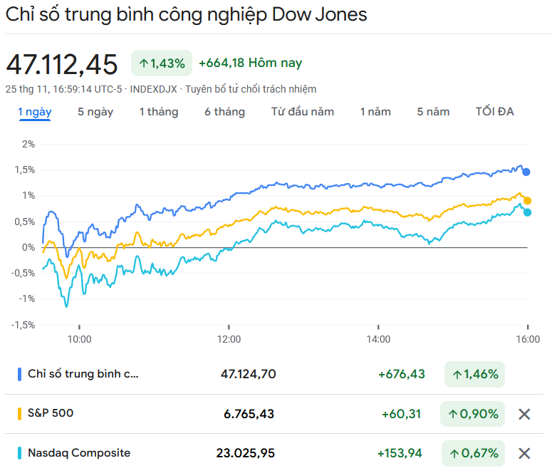 Đóng cửa phiên giao dịch thứ Ba ngày 25/11, chỉ số Dow Jones tăng 664,18 điểm (tương đương 1,43%) lên 47.112,45 điểm.