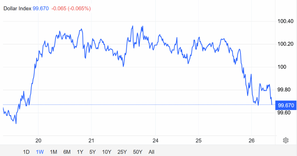 Chỉ số DXY giảm xuống dưới mốc 100 vào thứ Ba khi kỳ vọng về việc Cục Dự trữ Liên bang (Fed) sẽ cắt giảm lãi suất vào tháng 12 gia tăng. Niềm tin được củng cố sau khi Thống đốc Fed Christopher Waller phát tín hiệu ủng hộ việc cắt giảm, lặp lại quan điểm của Chủ tịch Fed New York John Williams và Chủ tịch Fed San Francisco Mary Daly, những người cũng cho rằng khả năng giảm lãi suất trong ngắn hạn là có thể xảy ra.