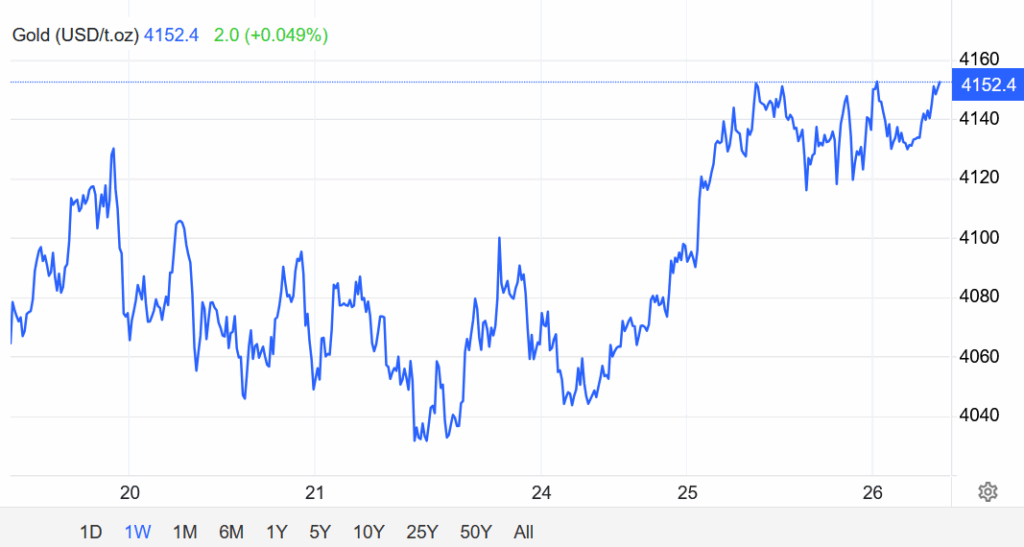 Kết thúc phiên giao dịch ngày 25/11, hợp đồng vàng giao ngay lùi 0,21% xuống $4130,67/oz. Giá vàng giao ngay trước đó đã đạt mức cao nhất kể từ ngày 14/11, và tăng gần 2% vào ngày 24/11 sau khi một số nhà hoạch định chính sách của ngân hàng trung ương Mỹ phát tín hiệu ủng hộ việc hạ lãi suất lần thứ 3 trong năm nay tại cuộc họp ngày 09-10/12.