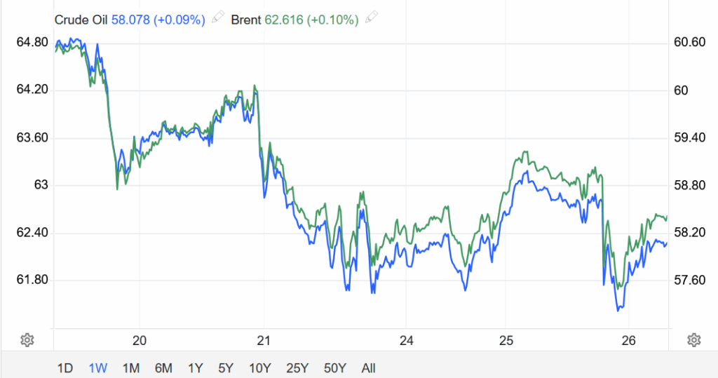 Kết thúc phiên giao dịch ngày 25/11, hợp đồng dầu Brent lùi 89 xu (tương đương 1,4%) xuống 62,48 USD/thùng.