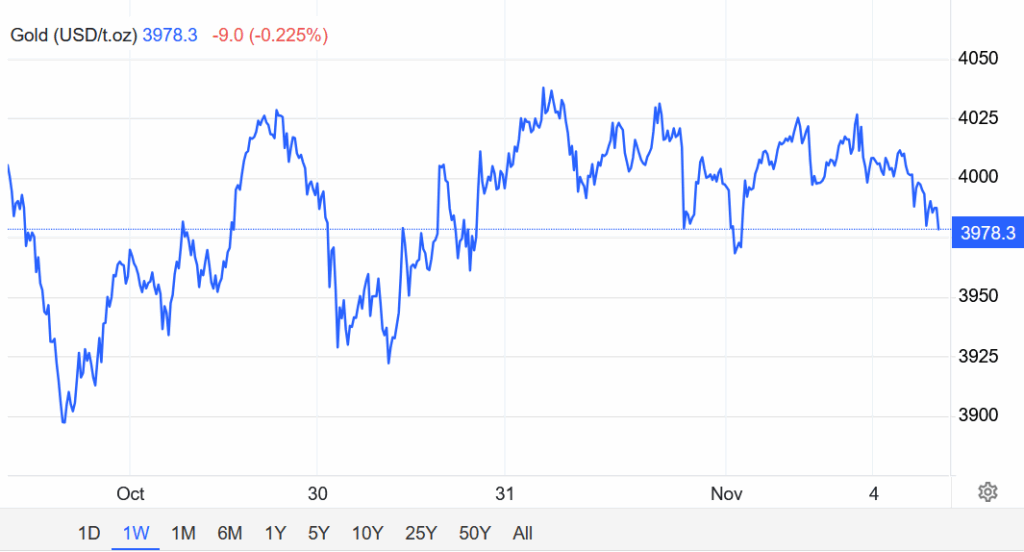 Kết thúc phiên giao dịch ngày 03/11, hợp đồng vàng giao ngay nhích 0,01% lên $4002,19/oz.