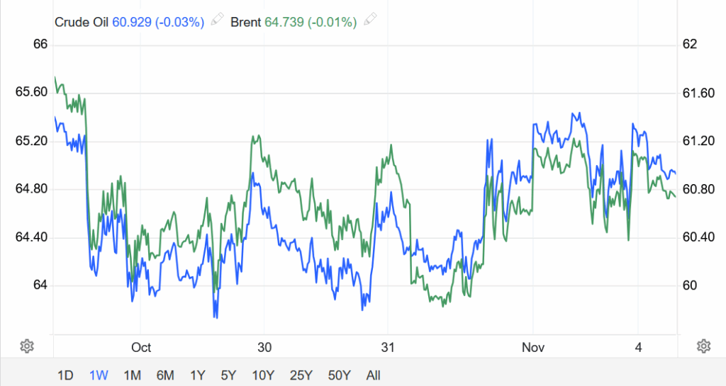 Kết thúc phiên giao dịch ngày 03/11, hợp đồng dầu Brent tiến 12 xu (tương đương 0,19%) lên 64,89 USD/thùng.