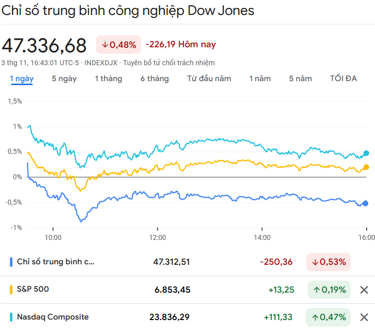 Trong khi đó, chỉ số Dow Jones mất 226,19 điểm (tương đương 0,48%) còn 47.336,68 điểm.